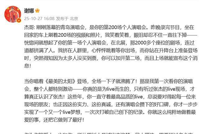 谢娜写道:“杰哥: 刚刚落幕的青岛演唱会,是你的第200场个人演唱会。昨晚录完节目,坐在回家的车上刷着200场的视频和照片,我笑着笑着,眼泪却忍不住一直往下掉——恍惚间就想起了你的第一场个人演唱会,在北展,那2000多个座位的剧场,连过道都挤满了人。我挤在人群里,心怦怦跳着等你出场,而你站在升降台上准备登场时,突然得知因为太多人没买到票,你可以加开第二场,而且上场就能宣布这个消息!